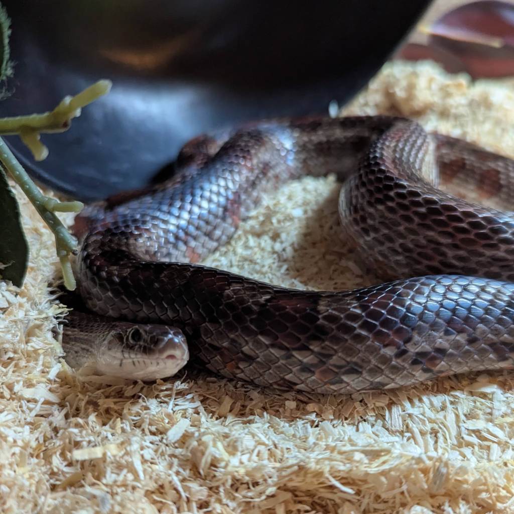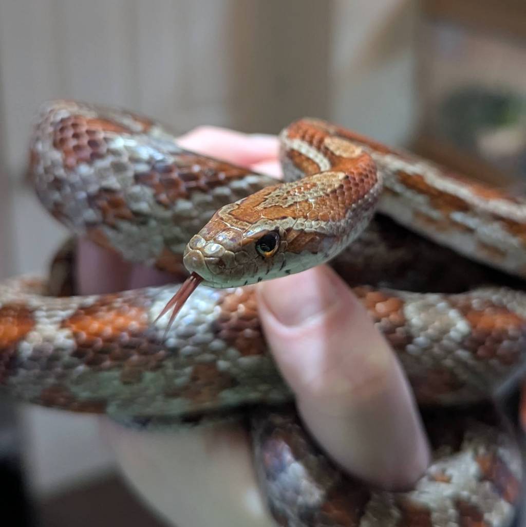 Snakey is a corn snake who arrived with us in June 2024 after being missing for several weeks and eventually found stuck in the back of a fridge. The owners felt he was best rehomed, so we took him into our care after removing him from the fridge.