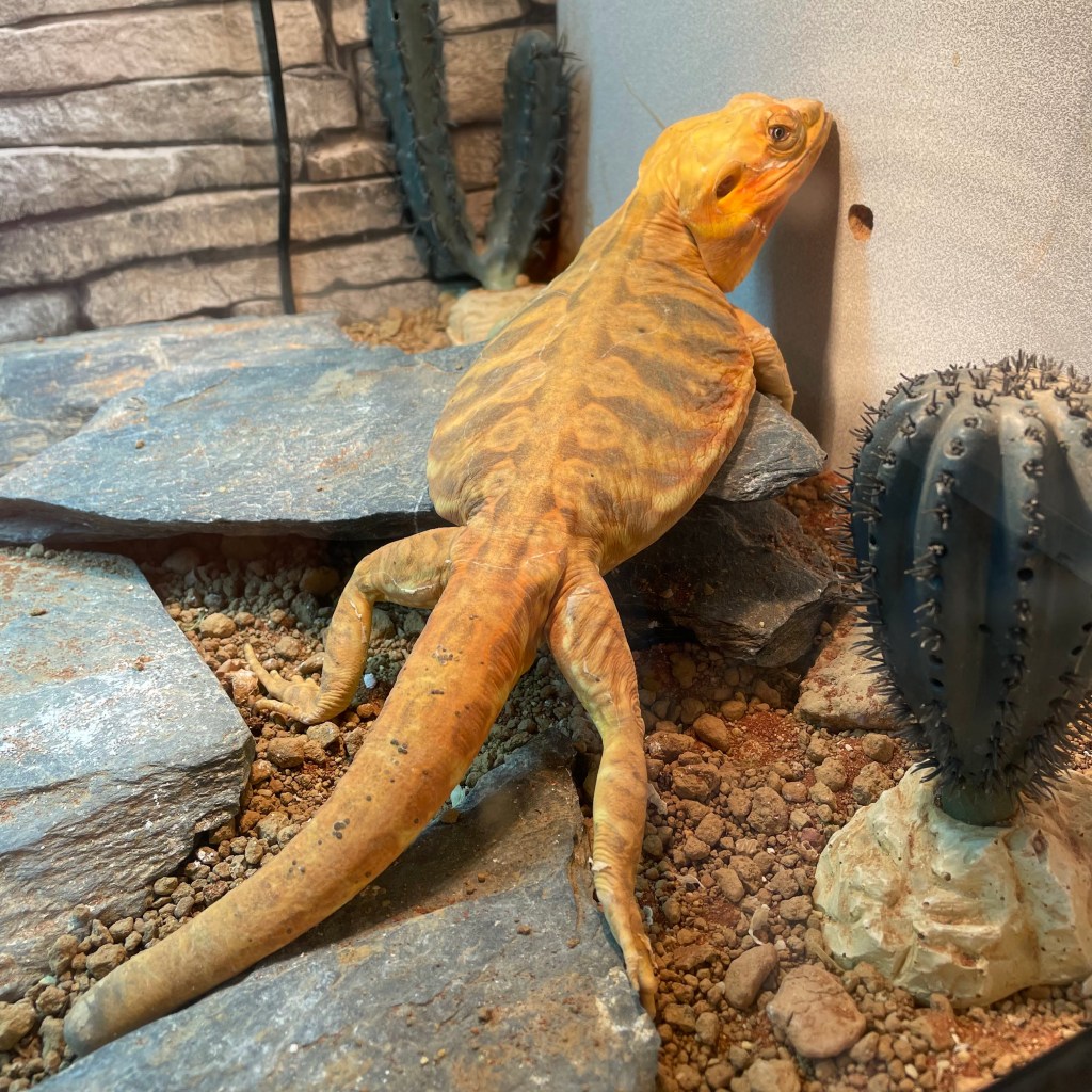 Pebbles is a leopard gecko, who’s age is unknown. She arrived in November 2021 with an infected wound on her back right leg and swelling in her abdomen. Under surgery, her leg was amputated due to a severe infection that left her bones almost dissolved and it was found that an abscess had taken over her ovaries and abdomen wall so this was also removed. She has remained a sanctuary resident here to continue her support.