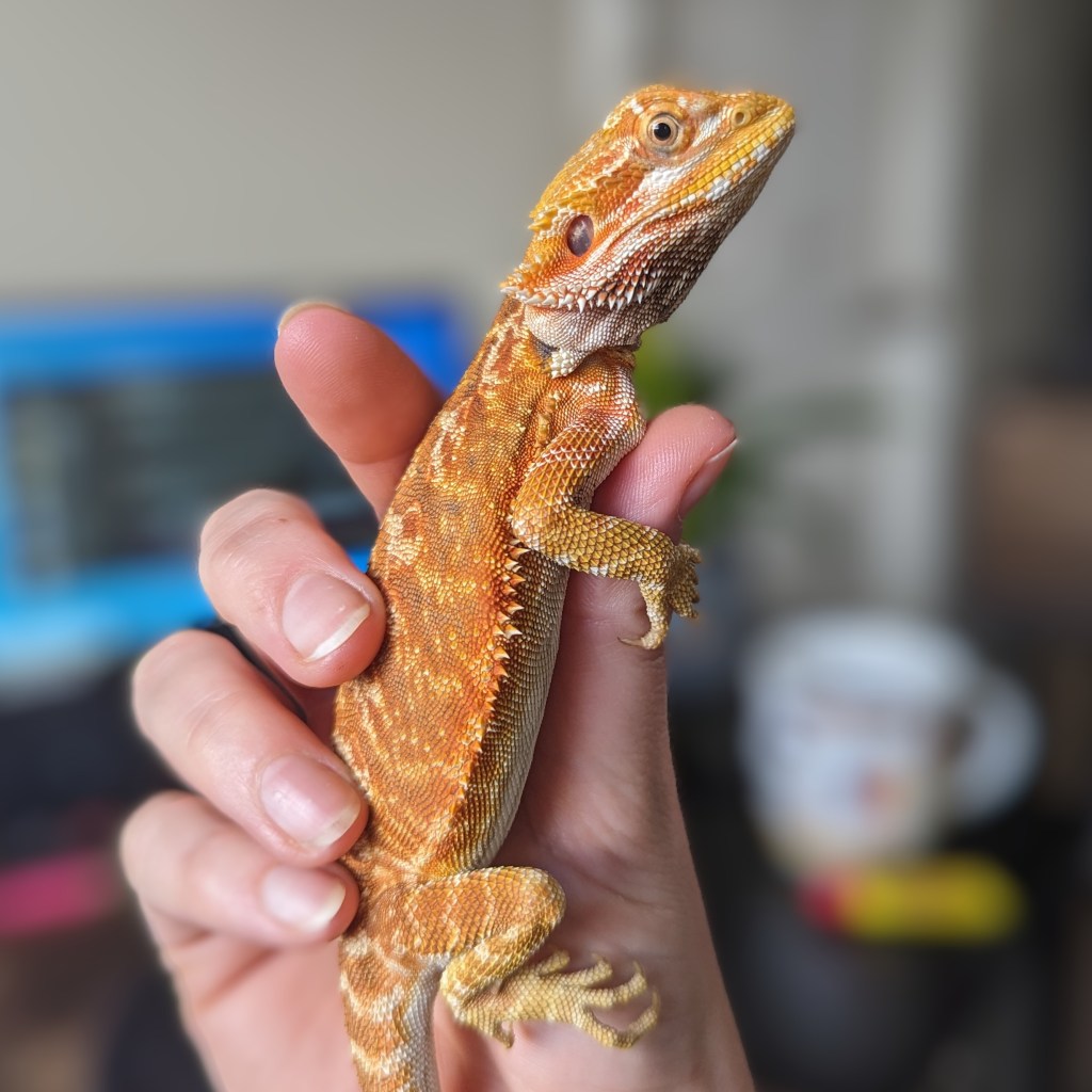 Opal was transferred to Jelly Exotics from a small animal rescue in October 2020, as a 1.5 year old silk-back bearded dragon. He was bred to not have any scales, which leads to a number of health problems, such as shedding problems, swollen eyes and sight impairment. He receives regular baths to assist his shedding, and has to be hand fed. He attends events to educate the public on silk-backs and the issues they face.